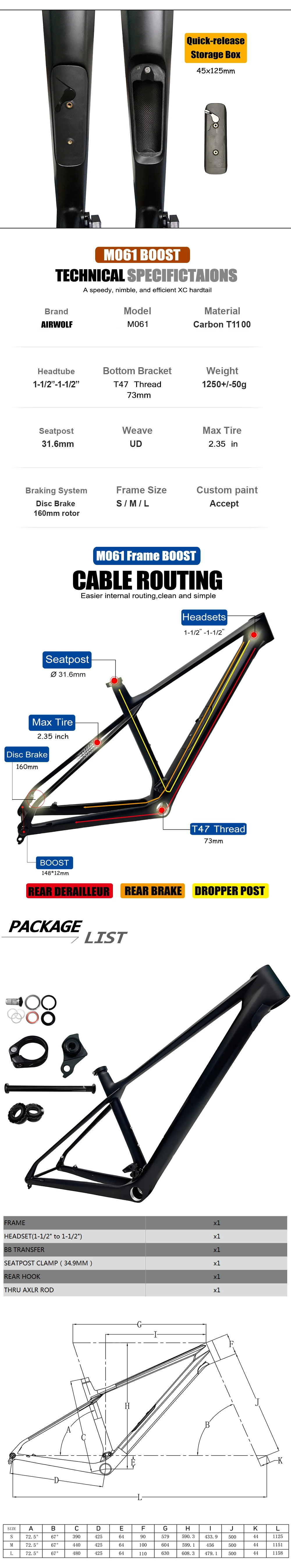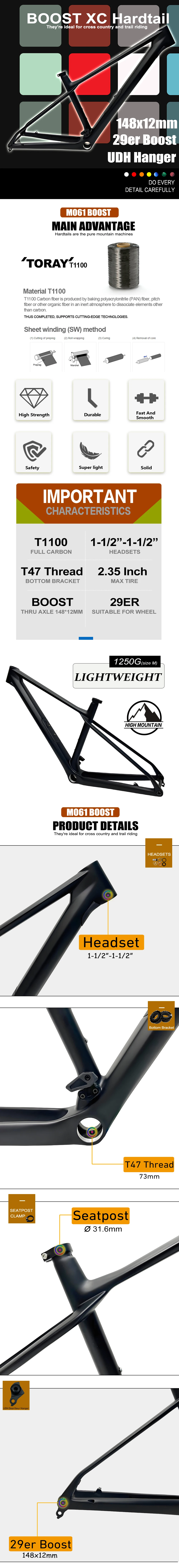 | Content | AIRWOLF T1100 Carbon Fiber Mountain Bike Frame 29ER 148 Thru Axle MTB Frame UD BSA Boost XC Hardtail Lightweight Bicycle Frame 30.9*420mm Carbon Seatpost![]() ![]() ![]() ![]() ![]() ![]() ![]() ![]() ![]() ![]() ![]() ![]() ![]() ![]() ![]() ![]() ![]() ![]() ![]() ![]() ![]() ![]() ![]() | ![]() | AIRWOLF 29ER Chameleon MTB Mountain Bike Frame 12*142MM 135*9MM Can Exchange Carbon Fiber Bicycleframe MTB Carbon Bycicle Hard Tail FrameFrame Material : T1000 Full Toray Carbon Fibre Frame Type : Carbon MTB Frame Mountain Bike Use: Mountain Bikes System : Mountainbike Frame Carbon 29ER Type : XC Carbon Weave : UD Bottom Bracket : PF30(46*73mm) Finish : Matte or Glossy Headsets : 1-1/8 to 1-1/2 Rear Hanger Size : 135*9mm Quick Release ,142*12mm Thru Axle Frame Size : S/M/L/XL Sutaible For Wheel : 29er Cable Routing : Internal Cable Routing Seatpost : 31.6mm Seatpost Clamp : 34.9mm Braking System : Disc Brake Disc Rotor Size : 160mm or 180mm Max Tire Size : 2.4 inch Weight : Frame 1120g (size M) Suitable Derailleur : Di2 And Mechanical Both Compatible with Fork : Straight,Suspension,Tapered Frameset Include : Frame,Headsets,Seatpost Clamp,BB Transfer,Thru Axle Rod,Aluminum parts Warranty : 2 Years![]() ![]() ![]() ![]() ![]() ![]() ![]() ![]() ![]() ![]() ![]() ![]() ![]() ![]() ![]() ![]() ![]() ![]() ![]() ![]() ![]() ![]() |